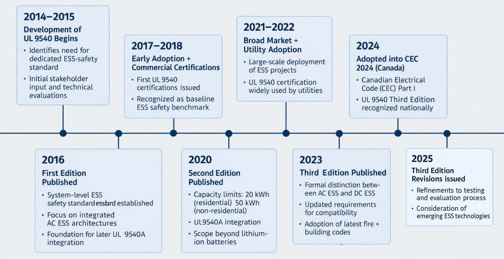 This topic traces UL 9540’s evolution from its First Edition (2016), through the Second Edition (2020), and into the Third Edition (2023, with 2025 revisions), highlighting: